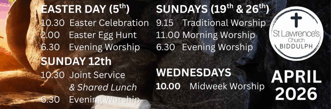 Here’s a calendar of some of the regular activities at St. Lawrence’s. Up to date news may be found on our Facebook or Instagram Pages. Search for St. Lawrence’s Church, Biddulph, or ‘biddulphchurch’.